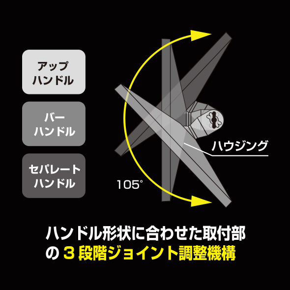 さらにジョイント調整機構で多くの車両や体格によりで使い勝手のよい調節角20°以上を確保。
