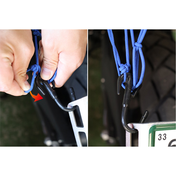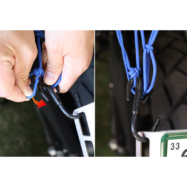最強フックと、大幅伸縮ゴムでガッチリ荷物をホールド