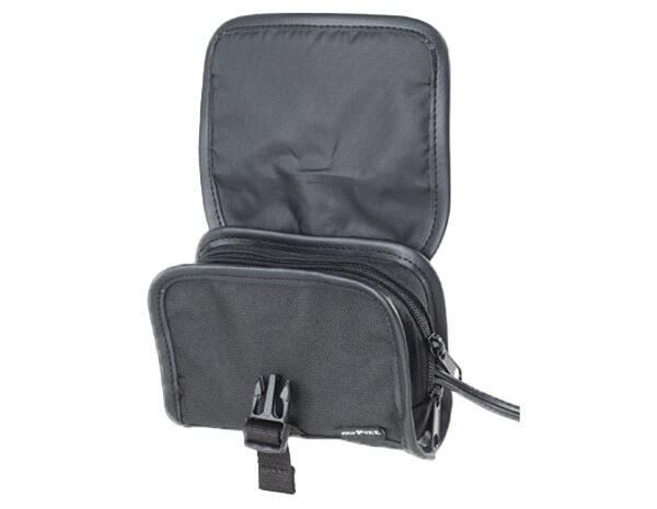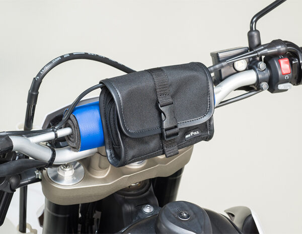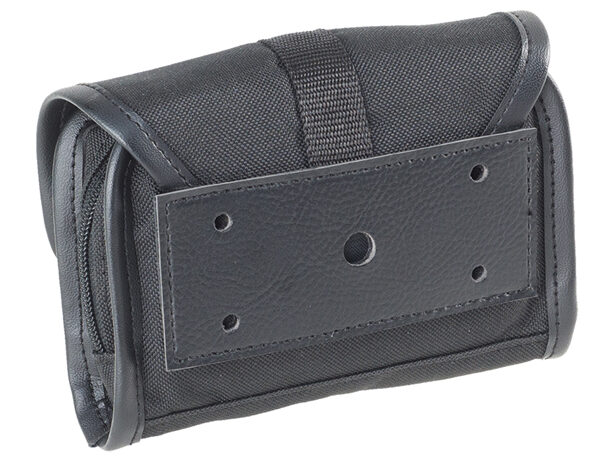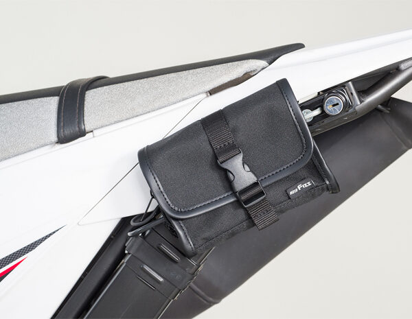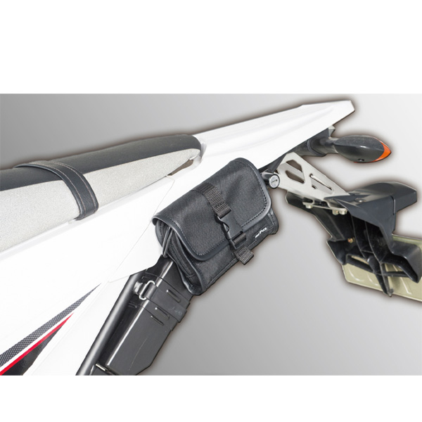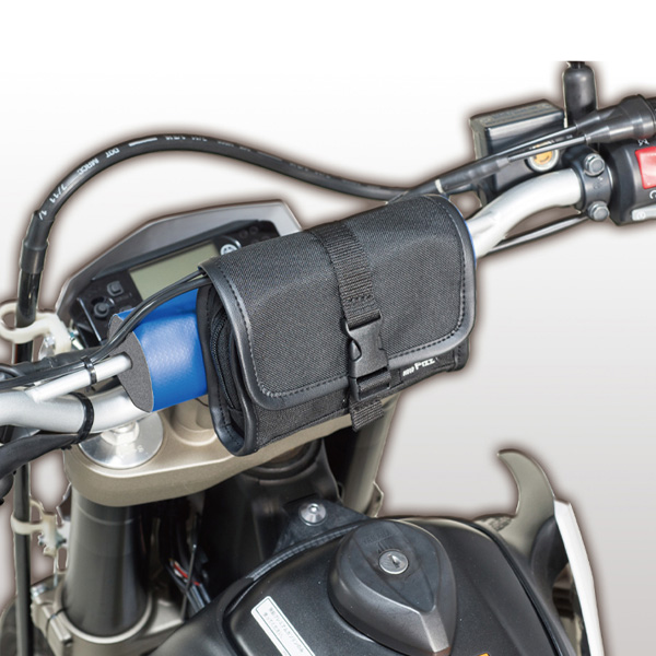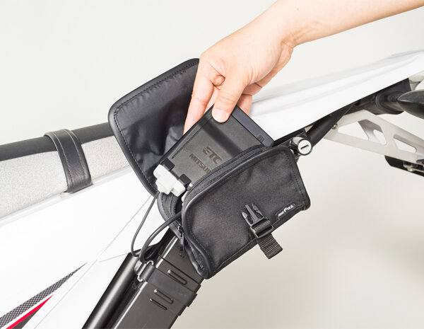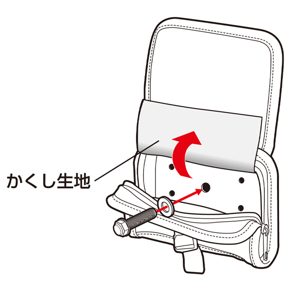 ポーチ内のかくし生地をめくり、車体にボルトで共締めしてください。ボルトの頭が小さい場合は市販のワッシャー等で調整してください。