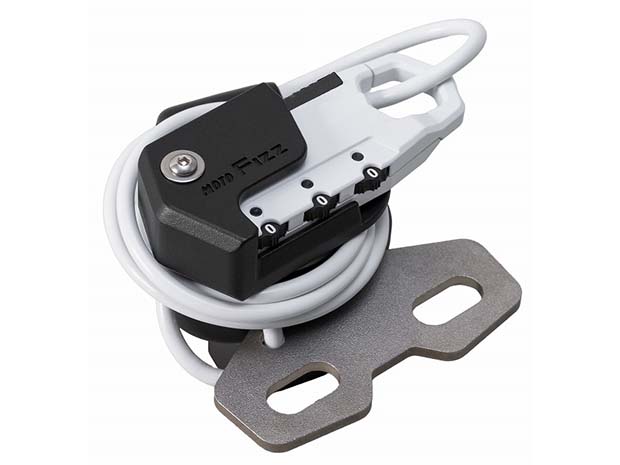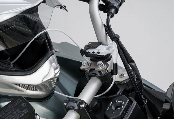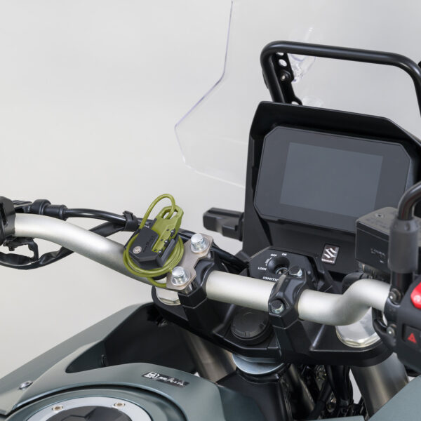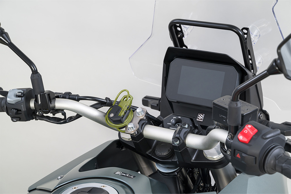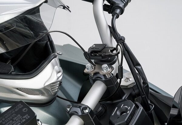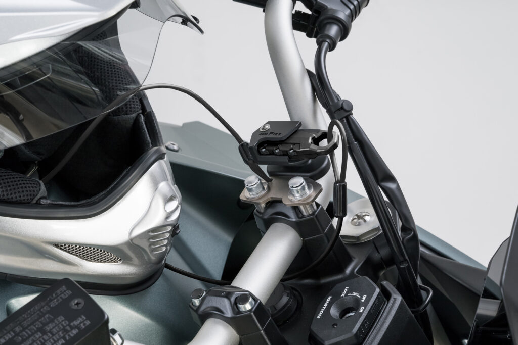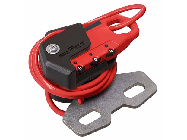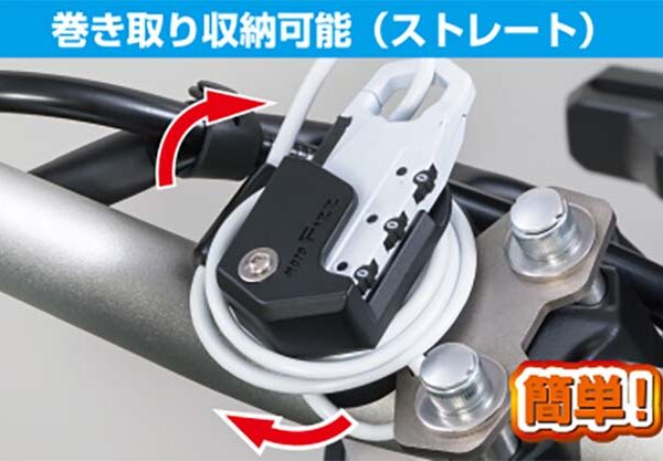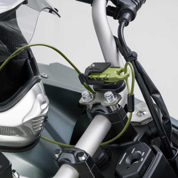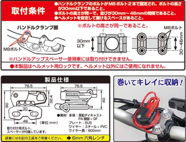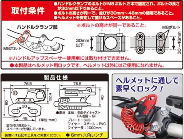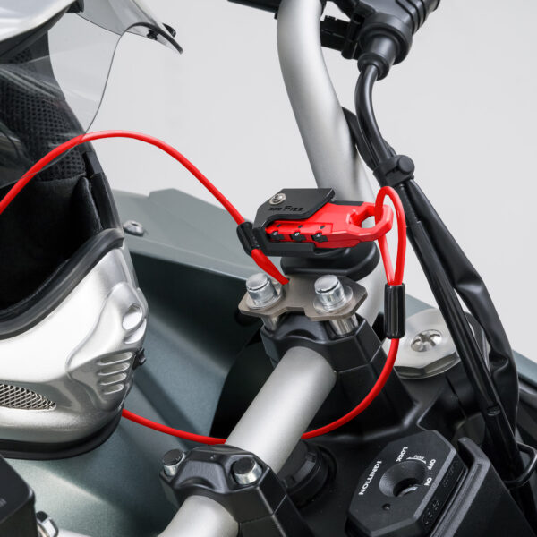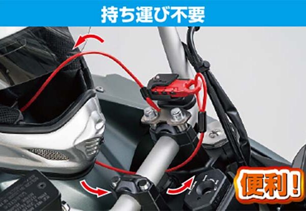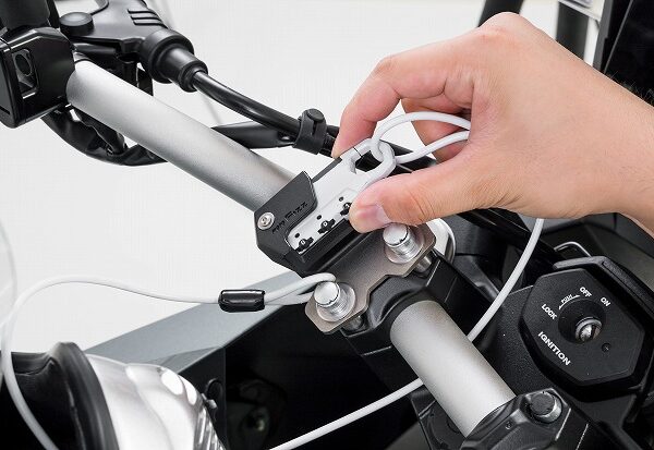 タンクに近い位置のハンドルクランプに取り付け出来るヘルメットワイヤーロック。