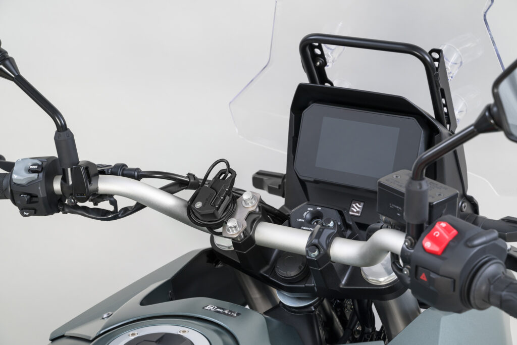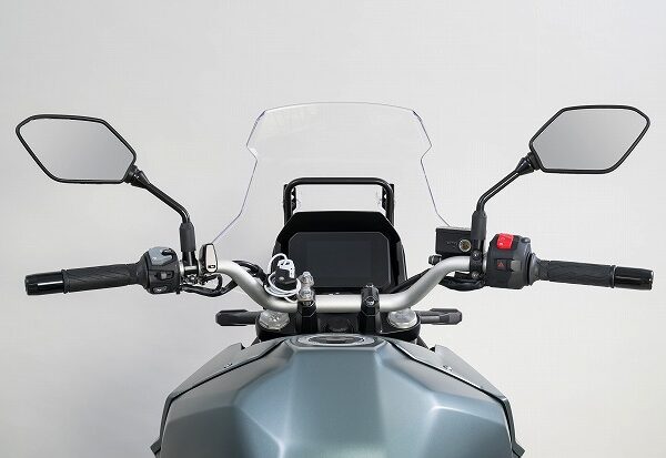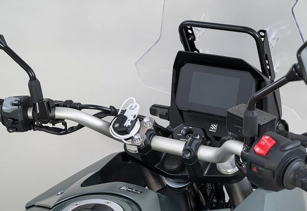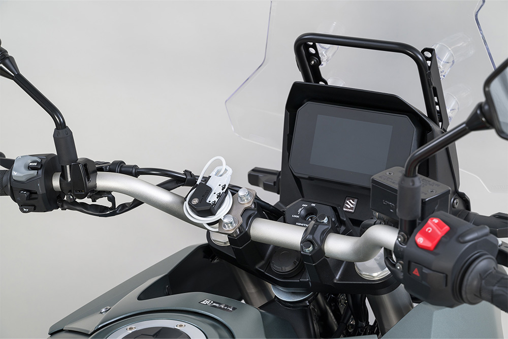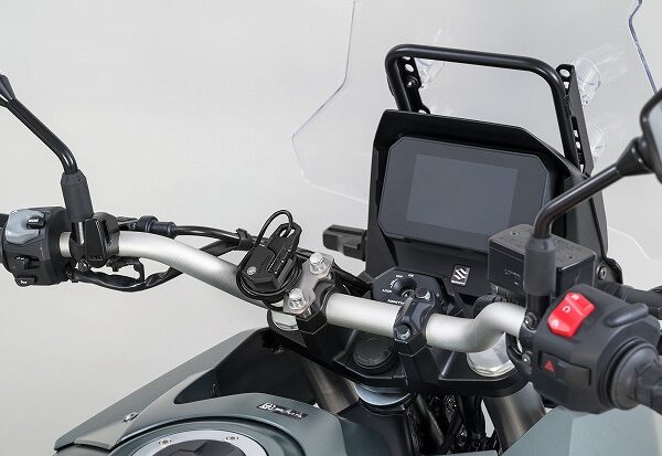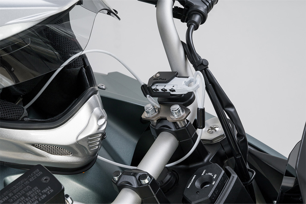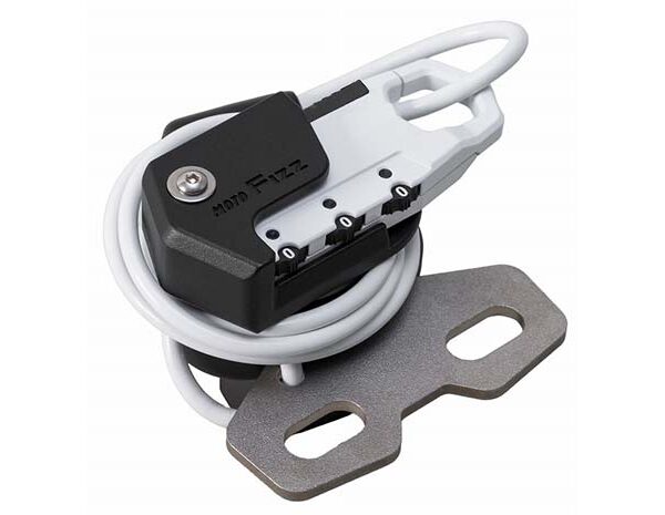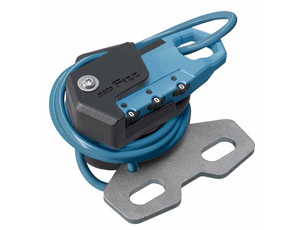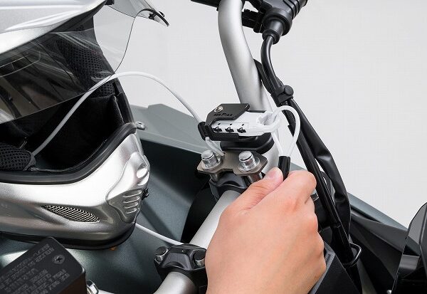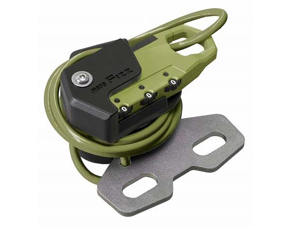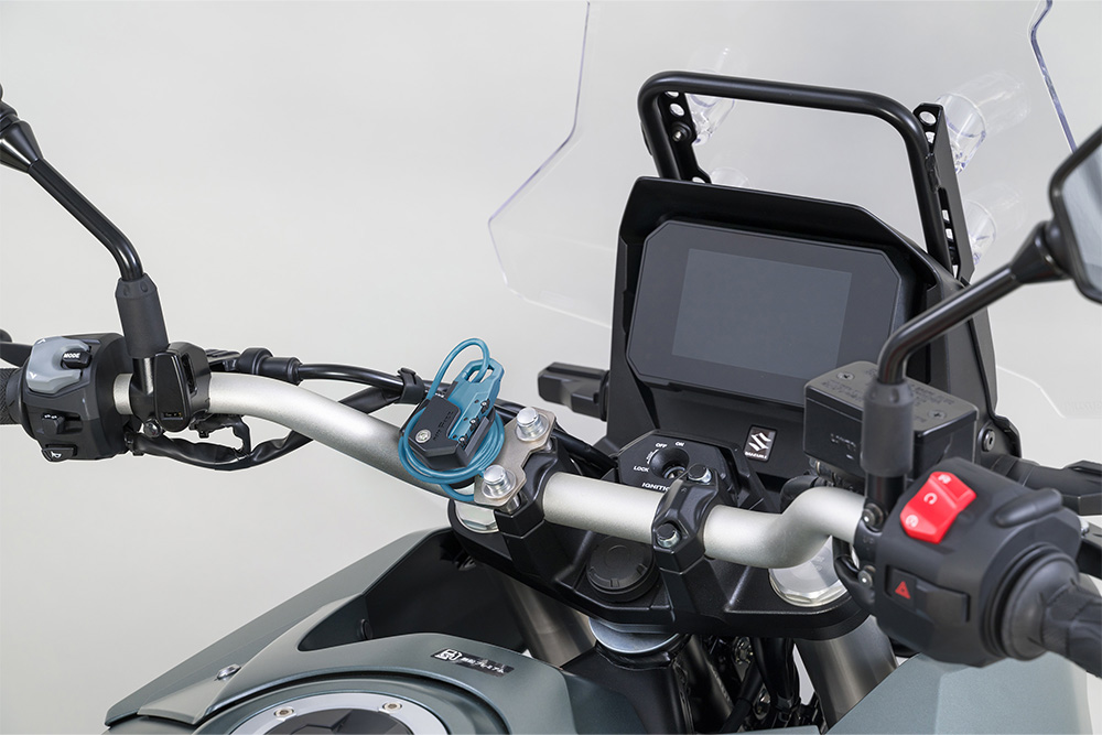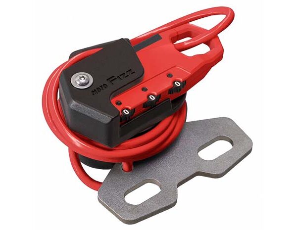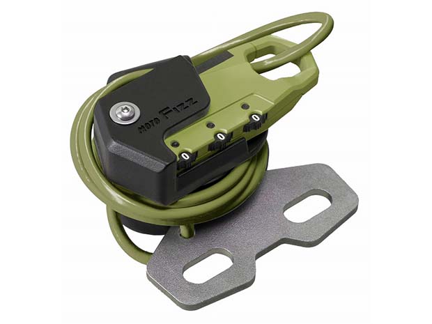 タンクに近い位置のハンドルクランプに取り付け出来るヘルメットワイヤーロック。