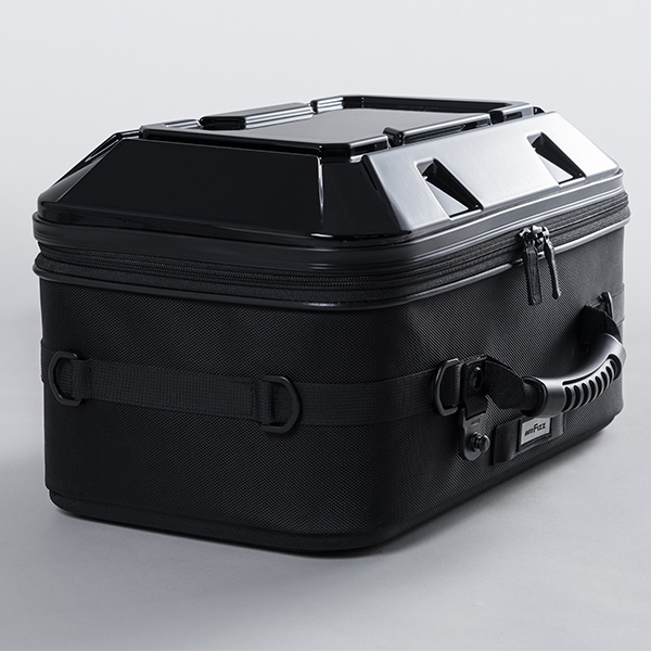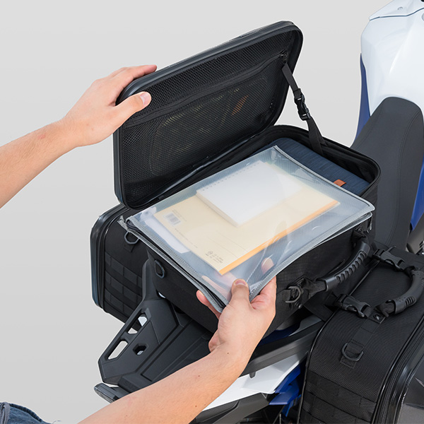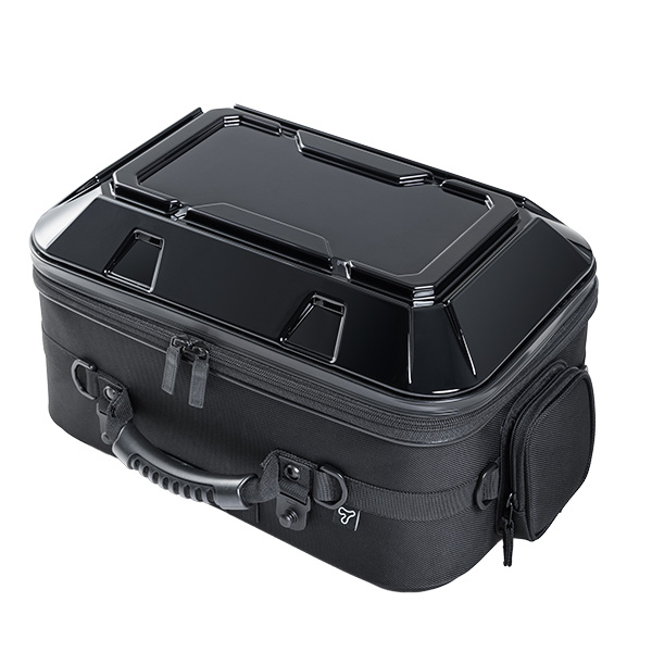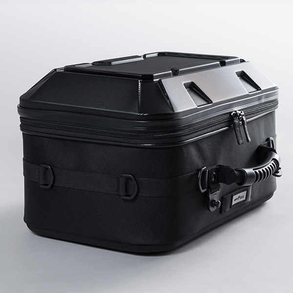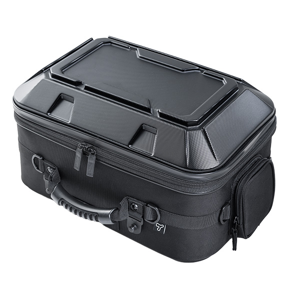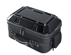 リアシートの限られた積載スペースを最大限活かす、大容量のシートバッグ。少し余裕を持たせた底面形状で広い開口部、上に積むことを考慮した形状のPCシェル、+4ℓの拡張機能と機能満載のツーリング仕様。