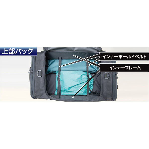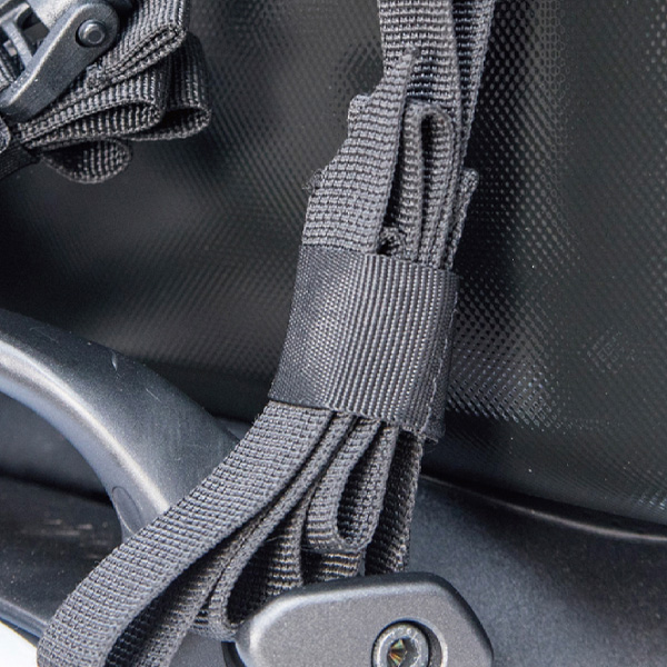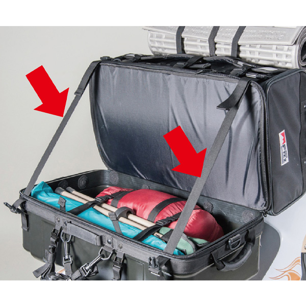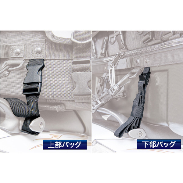 フル積載の状態で、下部バッグの荷物を取り出したい時に倒れるのを防ぐオープンストッパーベルトを装備。