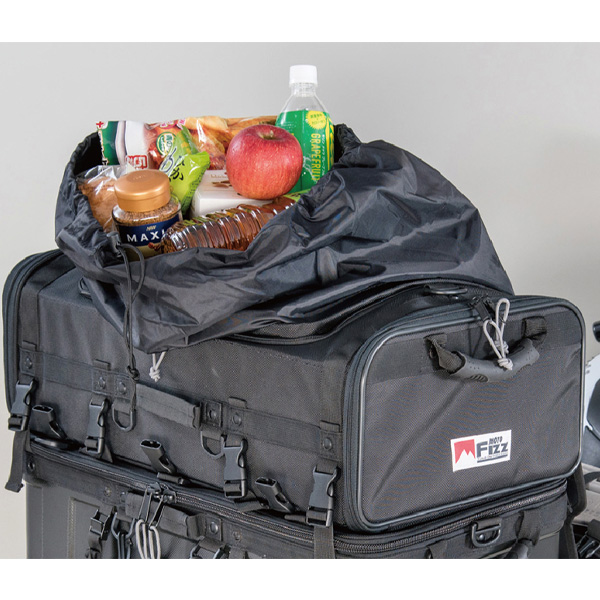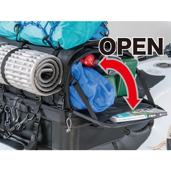 本体の荷物を崩さずに、不意に増加した荷物の積載に便利な収納袋を本体上面に装備。