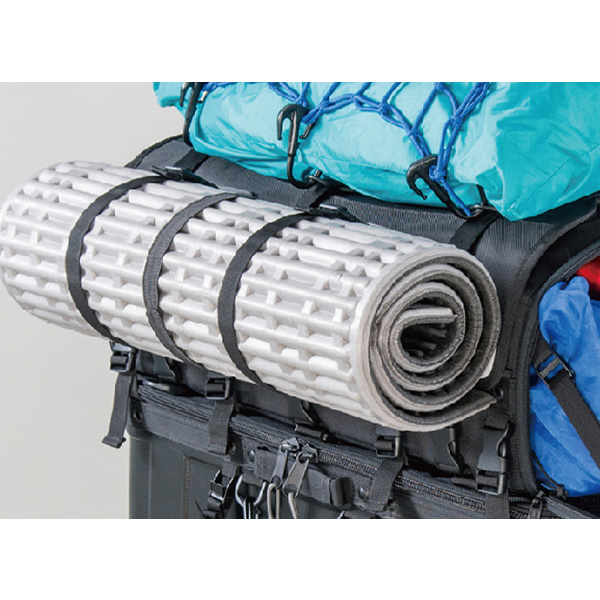 キャンプ用マット、テント、カメラの三脚等の長い物の積載に便利なホルダーベルトを装備。