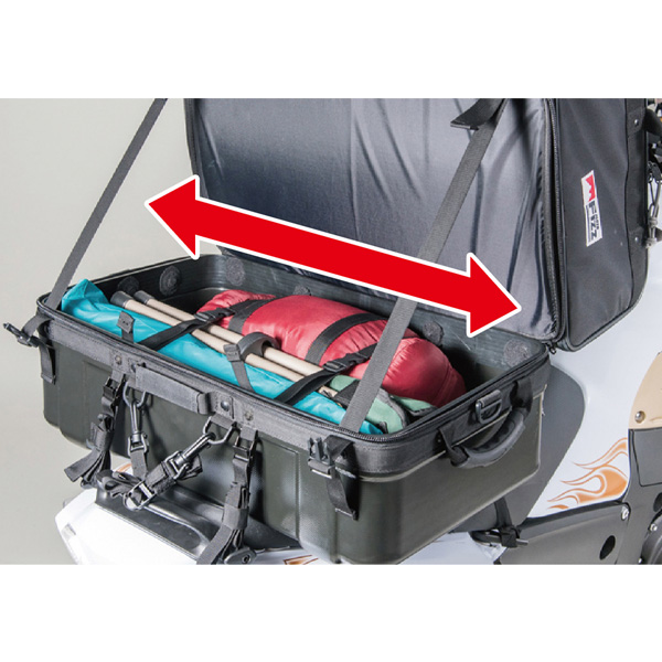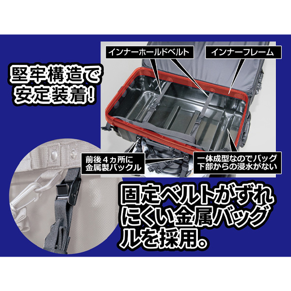 | 部品構成 | ・バッグ本体×1 ・セフティベルト×1 ・クイック固定ベルト×4 ・ボトムベース×1 ・ベルト止めストッパー×5 ・レインカバー×1 |