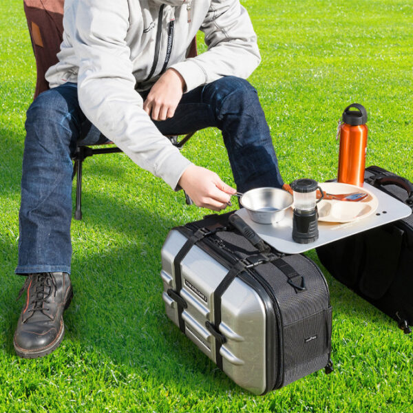 積載ベルト取付バックルに差し込むだけで簡単にしっかりとしたキャンプテーブルとして使用できます。