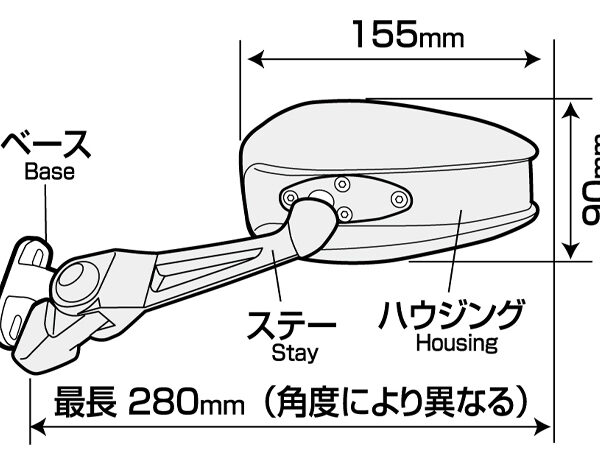 | 部品構成 | ・ミラー本体(左右共通)×1 ・スペーサー×1 ・パッキンA×1 ・パッキンB×1 ・M6×40mmボルト×2 ・M6×30mmボルト×2 ・M6×20mmボルト×2 ・M6×15mmボルト×2 ・M6ワッシャー×2 ・M6ナット×2 ・8mmボルトキャップ×1 ・6mm六角レンチ×1 ・4mm六角レンチ×1 ・2.5mm六角レンチ×1 |