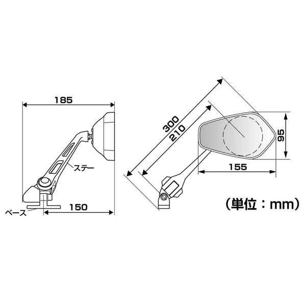 | 部品構成 | ・ミラー本体(左右共通)×1 ・スペーサー×1 ・パッキン×2 ・M6*40mmボルト×2 ・M6*30mmボルト×2 ・M6*20mmボルト×2 ・M6*15mmボルト×2・M6ワッシャー×2 ・M6ナット×2 |