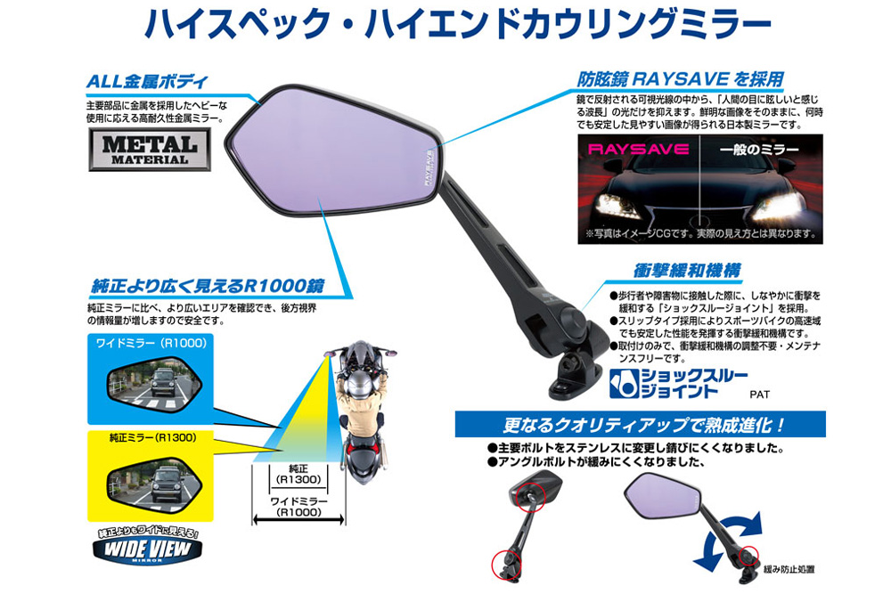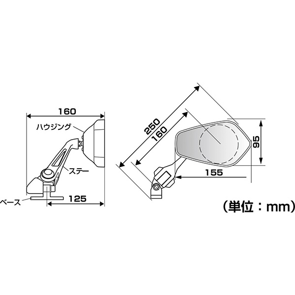 部品構成 ・ミラー本体(左右共通)×1 ・スペーサー×1 ・パッキン×2 ・M6*40mmボルト×2 ・M6*30mmボルト×2 ・M6*20mmボルト×2 ・M6*15mmボルト×2 ・M6ワッシャー×2 ・M6ナット×2