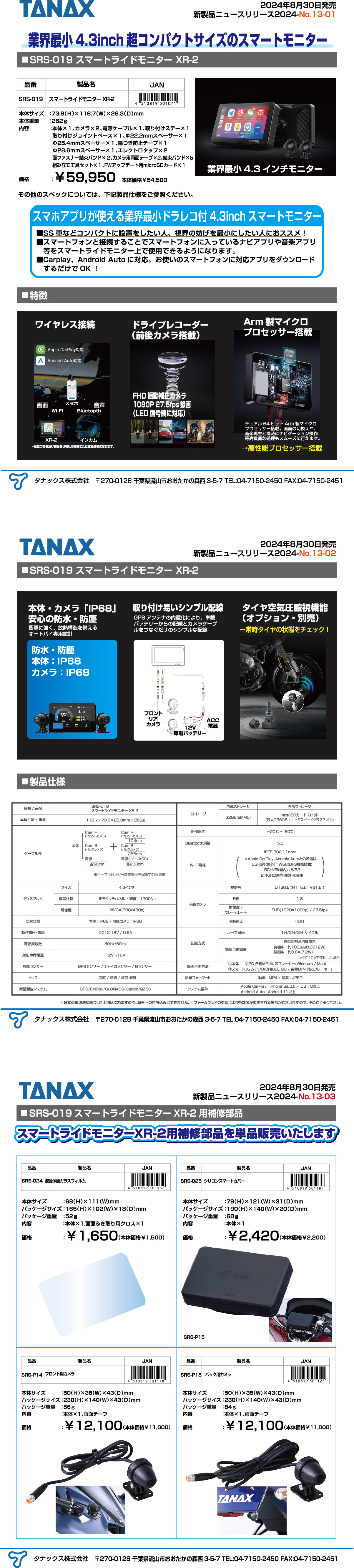 2024年8月30日に発売を予定しておりましたSRS-019スマートライドモニターXR-2ですが、出荷前点検の結果、取扱説明書と違う操作手順となる箇所がございました。ファームウェアを修正の上、再度販売をさせて頂きます。