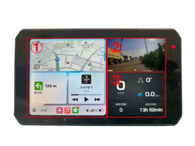 1. 融合モードを追加し、①Carplay/Android Auto、②ドラレコ画面、③車両データ(空気圧や走行距離等)を1つに表示できる機能を追加したした。