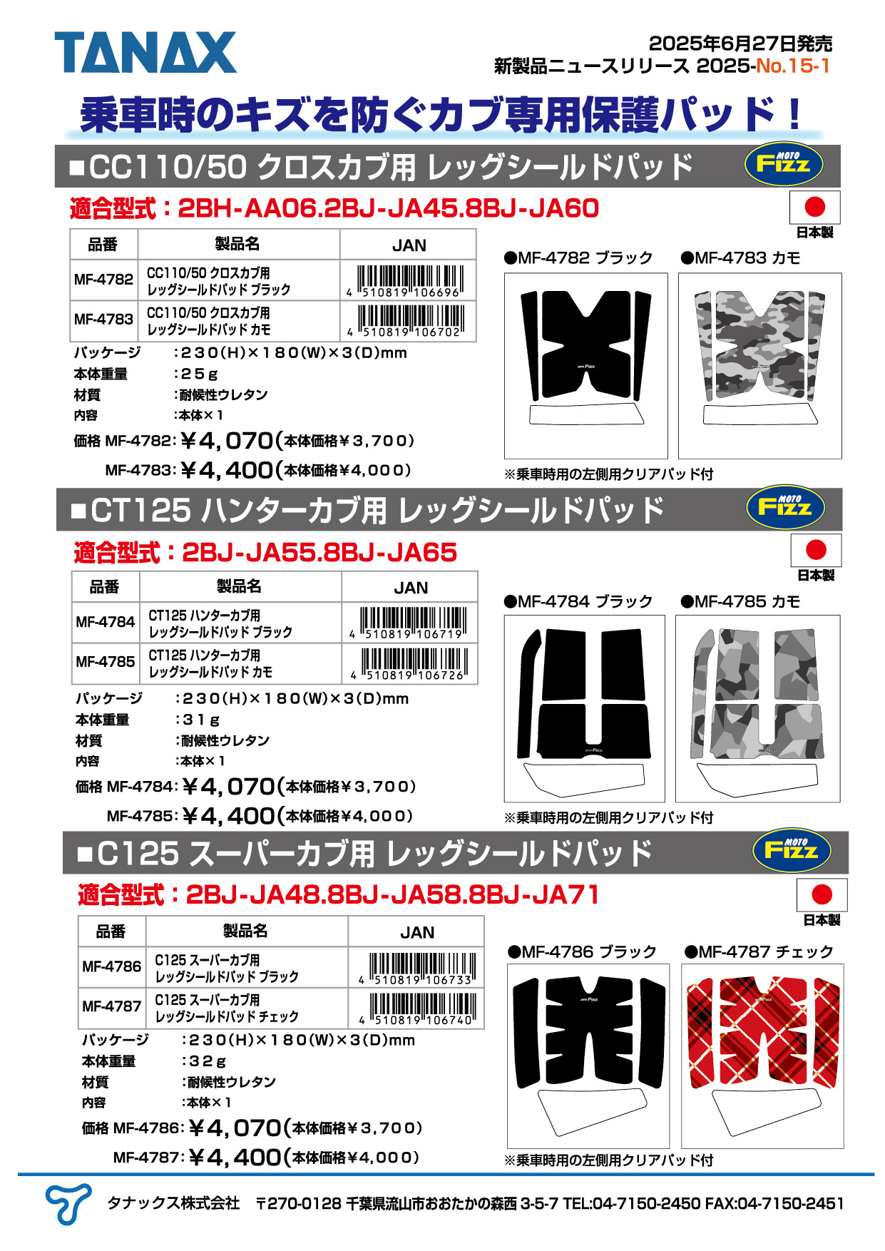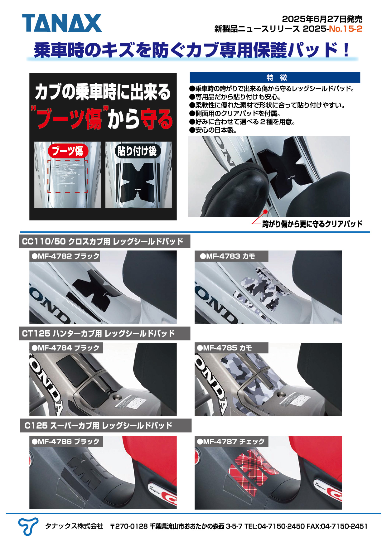 CC110/50 クロスカブ用、CT125 ハンターカブ用、C125 スーパーカブ用 のレッグシールドパッド を発売
