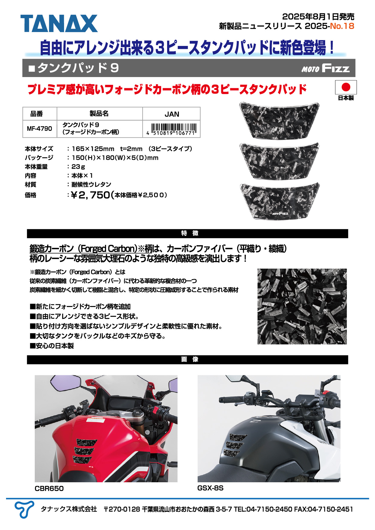 2025年8月1日にプレミア感が高いフォージドカーボン柄の3ピースタイプのタンクパッド9を発売
