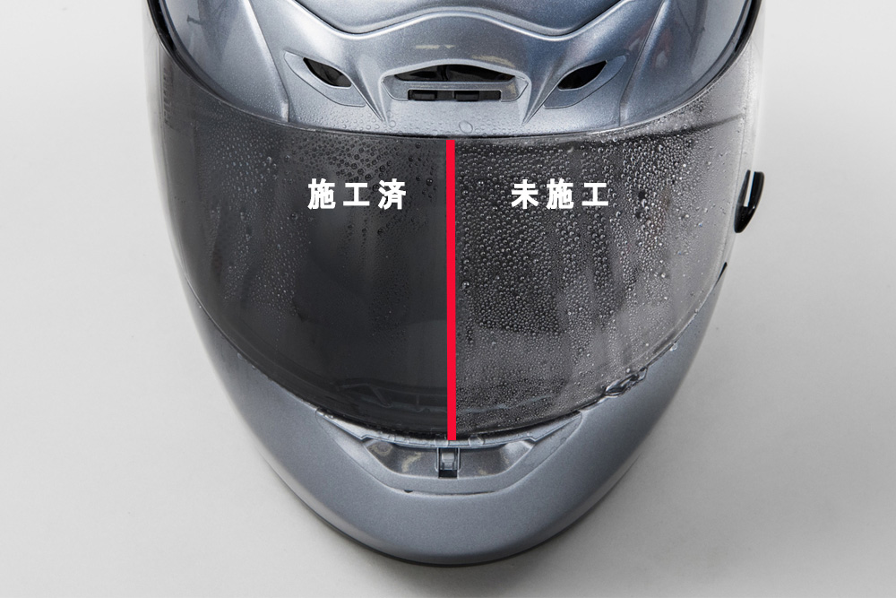 ■特殊シリコン系素材を使用した、ヘルメットシールド専用はっ水剤。
