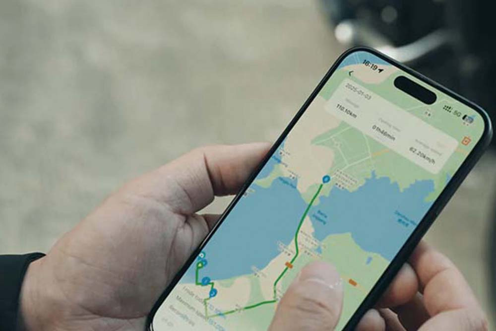 専用アプリでバイクの走行ルートをリアルタイムに記録し、詳細な走行記録(走行ルート、走行距離、走行時間、平均速度、最高速到達地点)をスマートフォンで確認することができます。 ツーリングの軌跡をアプリ上に残せます。